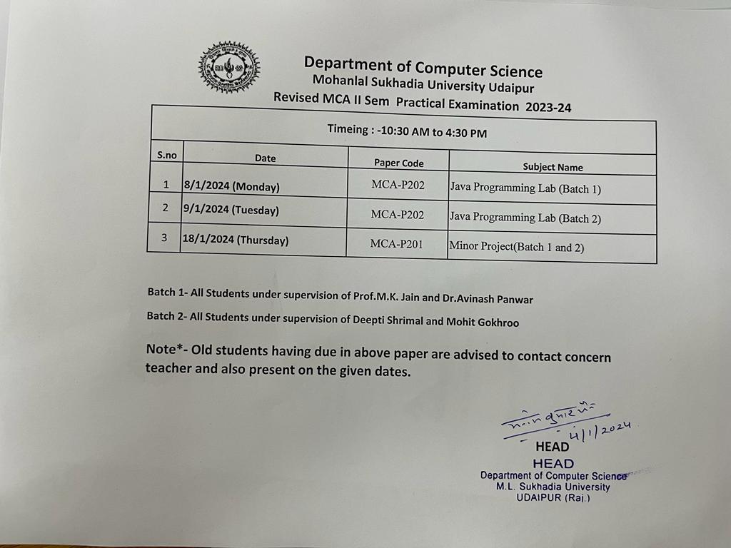 Revised MCA II Semester Practical Exam Time Table